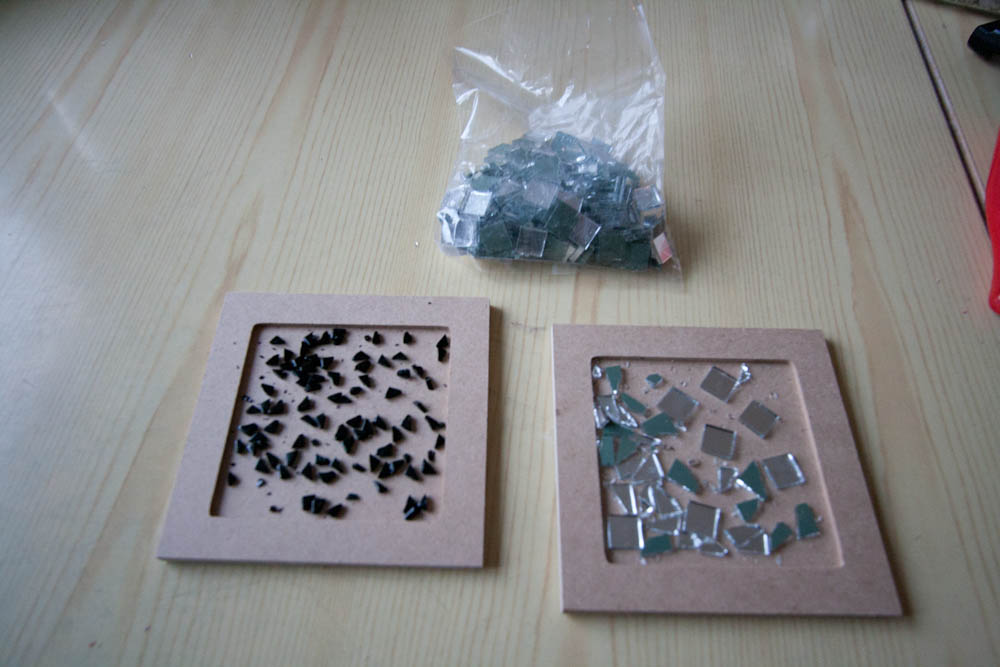 Idag på jobbet fick jag helt plötsligt en idé att göra nåt med all den glasmosaik som jag har hemma. Jag svängde förbi Panduro på väg hem från jobbet och hittade där jättebra underlägg gjorda för att pyntas med mosaik. I våras hade jag samma idé men hittade då aldrig några underlägg så jag skapade egna av en gammal masonitskiva, men det blev aldrig så bra, detta kommer att bli bättre tror jag. Mosaiken jag har är till stora delar ärvd från min farmor som är min stora idol inom pysslandet, hon gjorde det mesta, broderade, knypplade, vävde, mosaikade och mycket mera 🙂 De har legat orörda sen hon dog 1993 så det är dags att göra nåt fint av det istället, så vi får se hur vad det slutar med.
