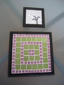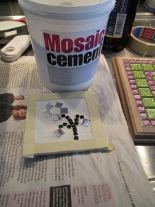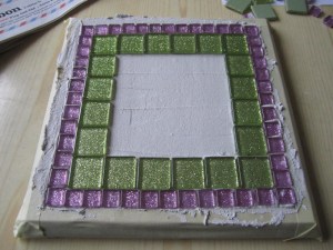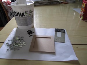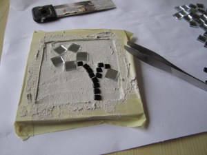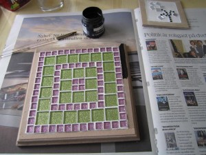 Sedan är det bara att vara lite konstnärlig och hitta på mönster och placera ut mosaikbitarna där de ska vara och trycka till lite grann! (kan vara bra att testa sitt mönster på plattan utan fästmassa på först så att man vet att mönstret funkar). Ta sedan av maskeringstejpen så att den inte fastna på ramen för alltid…