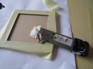 Börja med att blanda till fästmassan (min heter Multifix, kan hittas på Panduro) och bred sedan ut ett jämnt lager där du ska fästa mosaikplattorna. Jag satte maskeringstejp runt kanterna som inte skulle prydas med mosaik för att inte kladda ner den ytan.