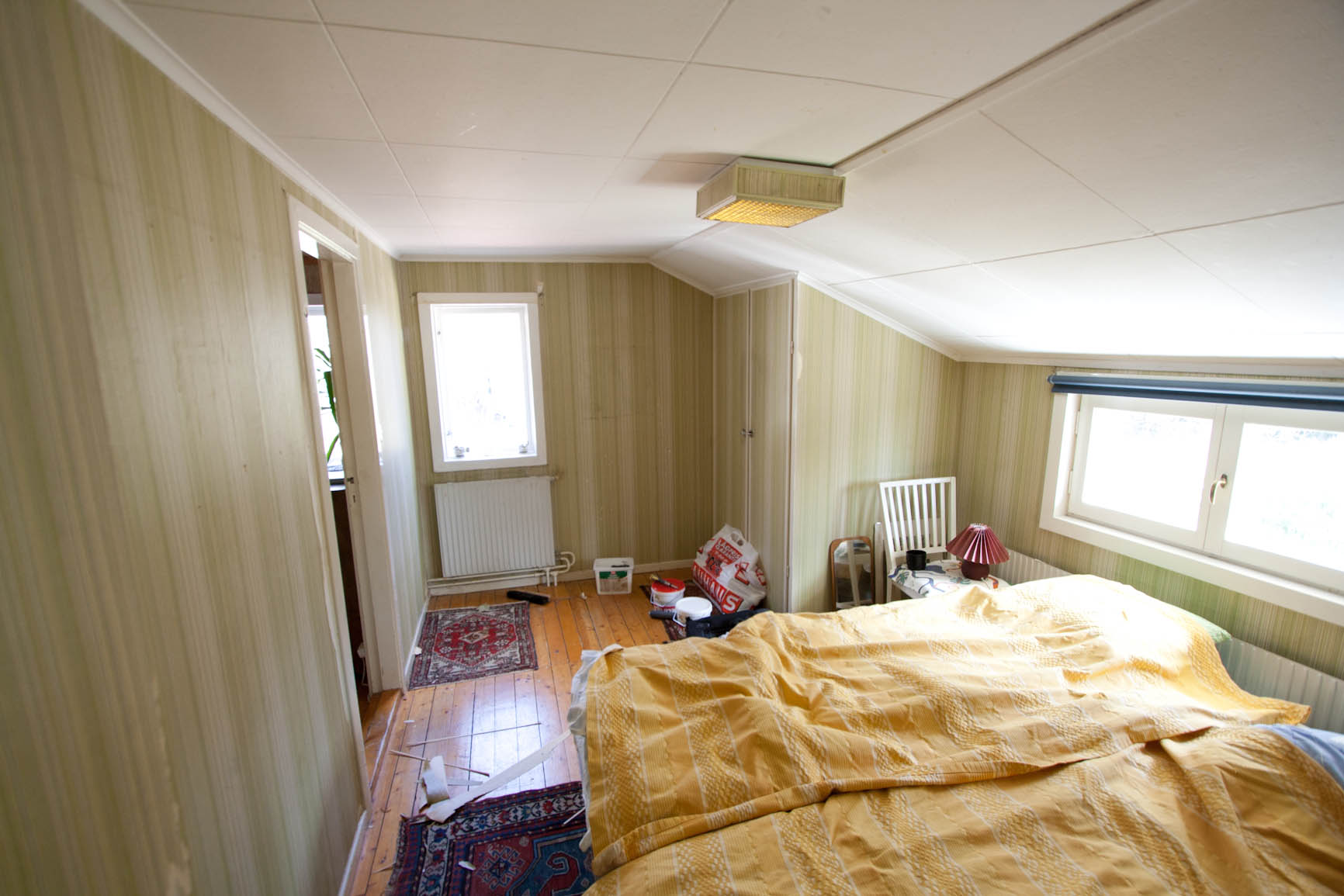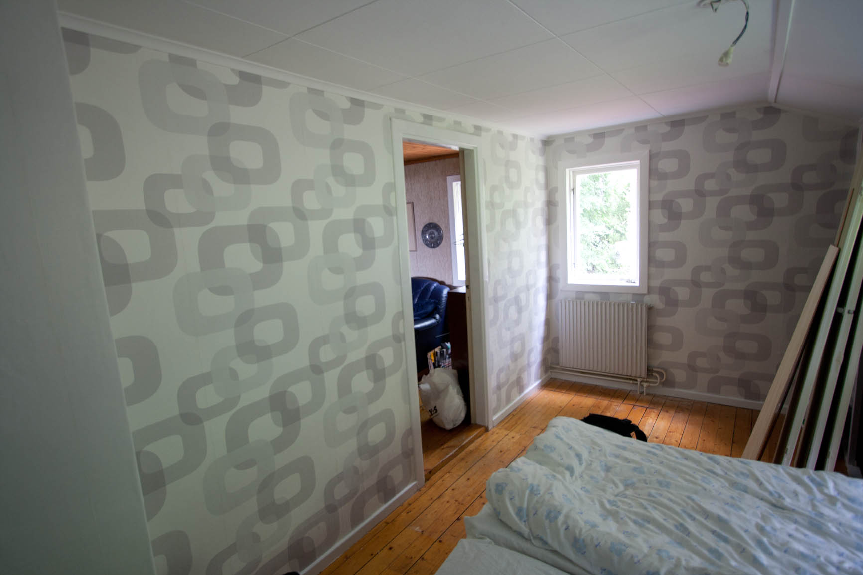 Jag och Patrik såg till att sätta upp tapeter på den sista väggen, så nu är hela rummet tapetserat! Och vi har fått in värsta tekniken på att tapetsera, det gick riktigt snabbt OCH vi var glada både innan, under, och efter tapetseringen! Här är resultatet: