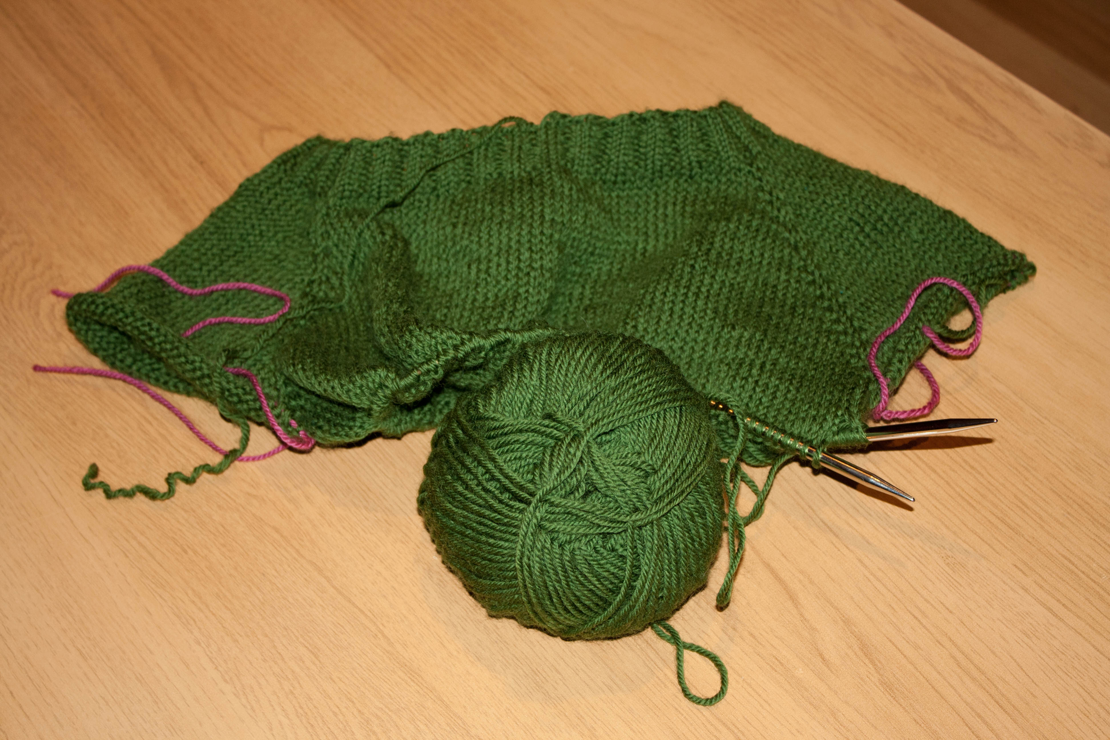 Ja, efter att ha haft lite problem i början och repat upp typ 3 gånger börjar det nu kännas som om jag har kommit en bit på väg. Jag har satt i tråd för maskorna där armarna kommer stickas så småningom. I mönstret stod det att man skulle fortsätta att öka tills stickningen ”nästan möts under sina armar”. Lite svårtolkat men jag tror och hoppas att den i slutändan kommer att bli i alla fall ungefär rätt storlek.