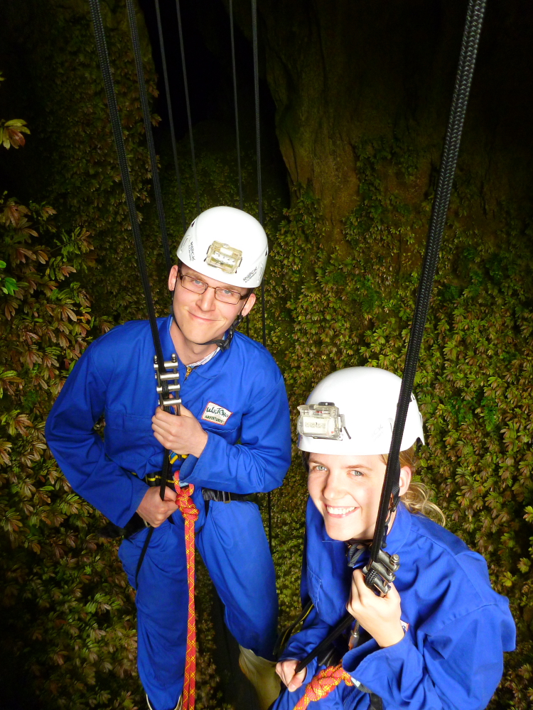 Idag har vi gjort det häftigaste hitills, varit på en guidad fyratimmarstur ner till Waitomo-grottorna. Det började med att man fick repellera ner sig själv genom en 100 m djup ravin fritt hängandes i luften. Det var fantastiskt vackert i ravinen. Efter det bar det av uppåt längs ravinen och sen in i grottan, jag har aldrig sett lysmaskar (tror det heter så på svenska…) förut, men det var som att titta på stjärnhimmelen en mörk kväll. Vi klättrade också upp för en typ 30 m hög stege, den andra halvan var ganska jobbig för händer och armar.