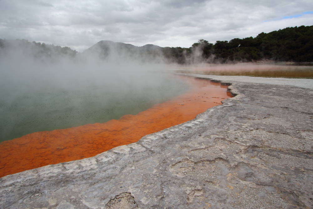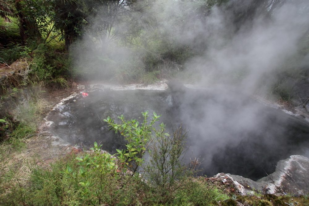 I ett område i stan vi gick igenom ångade det från varje trädgård och ut ur gatbrunnarna. Vi åkte sen 3 mil från Rotorua till ett geotermiskt område med stora bubblande lerpölar/sjöar. Helt ofattbara färger!
