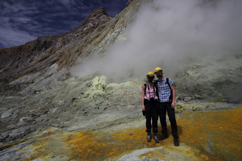 Igår åkte vi ut till vulkanön White Island, och det var verkligen en aktiv vulkanö. Det bubblade och ångade på en helt annan nivå än i Rotorua, när vi gick iland (efter en båtresa på 1,5 h över ett gungit hav där minst 5 personer spydde, jag klarade mig dock – åksjukepiller är bra att ha) fick vi gasmasker.