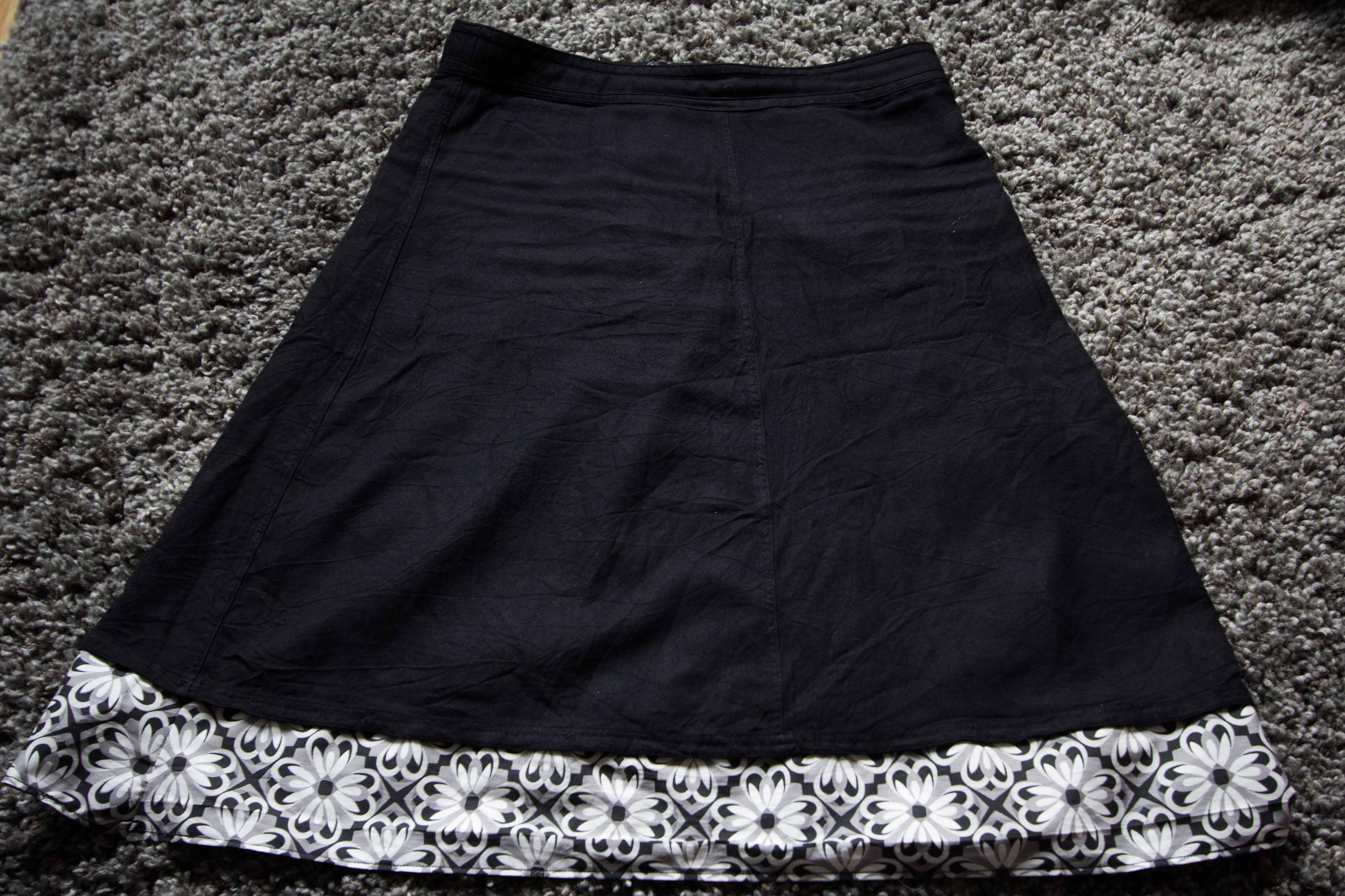 Sen fick jag helt plötsligt en idé som var mycket bättre 🙂 Jag kom på att jag långt ner i garderoben har en svart enkel kjol som jag inte använder för jag tycker den är så tråkigt. Nu har jag sytt på en remsa med det mönstrade tyget längst ner på den svarta kjolen och det blev riktigt bra!