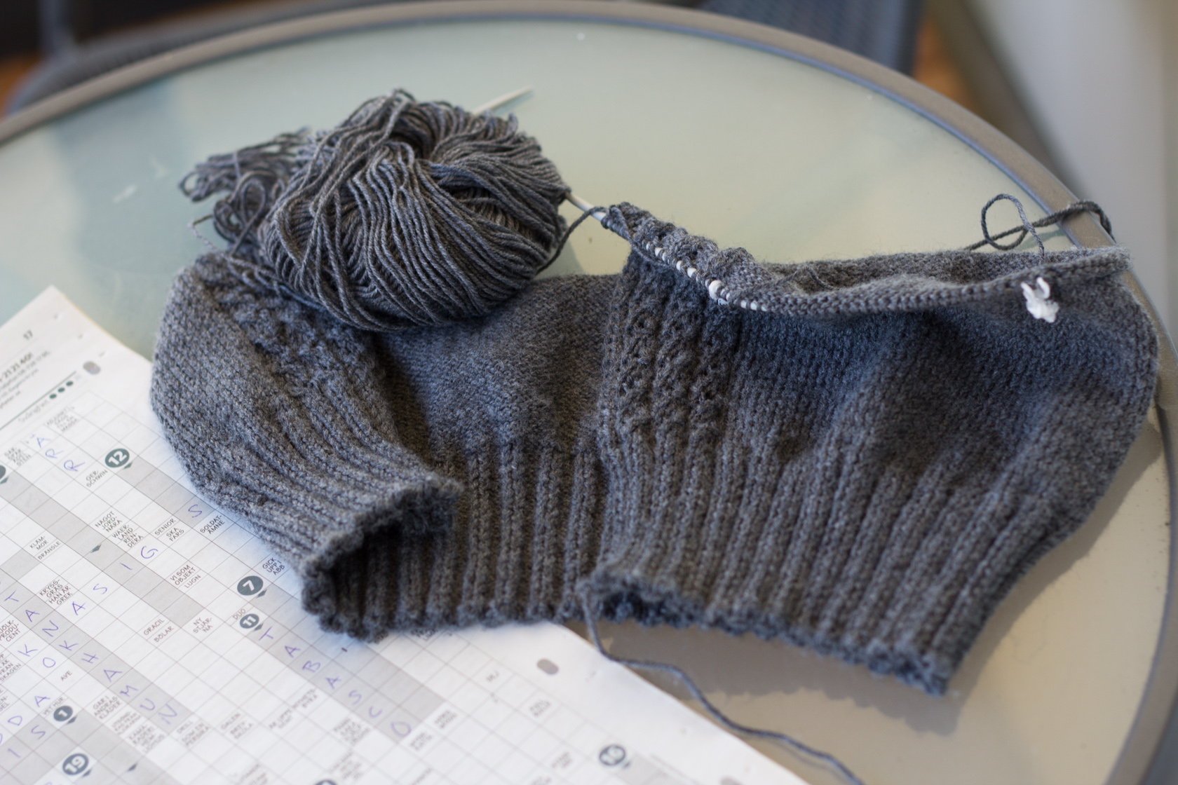 Jag börjar tycka att jag nu ändå har kommit en bit på väg, men jag gissar att jag kommer att vara lagom less på den när jag kommer till att ärmarna ska stickas…
