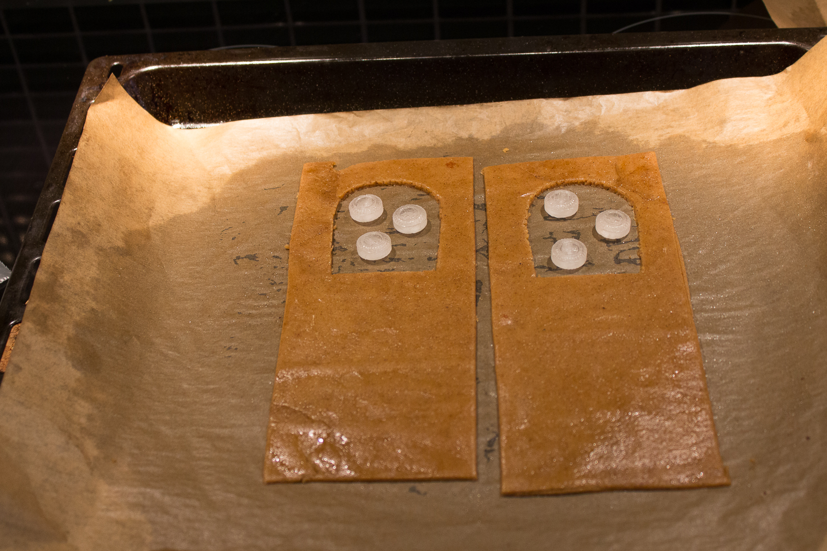 … i ugnen smälter halstabletterna och när de fått svalna ett tag går det jättebra att med en stekspade få loss pepparkakan med fönster från plåten. Fönstret är dessutom betydligt mer hållbar än själva pepparkakan.