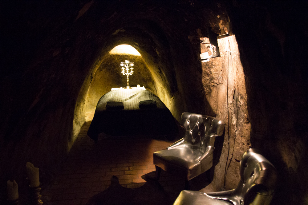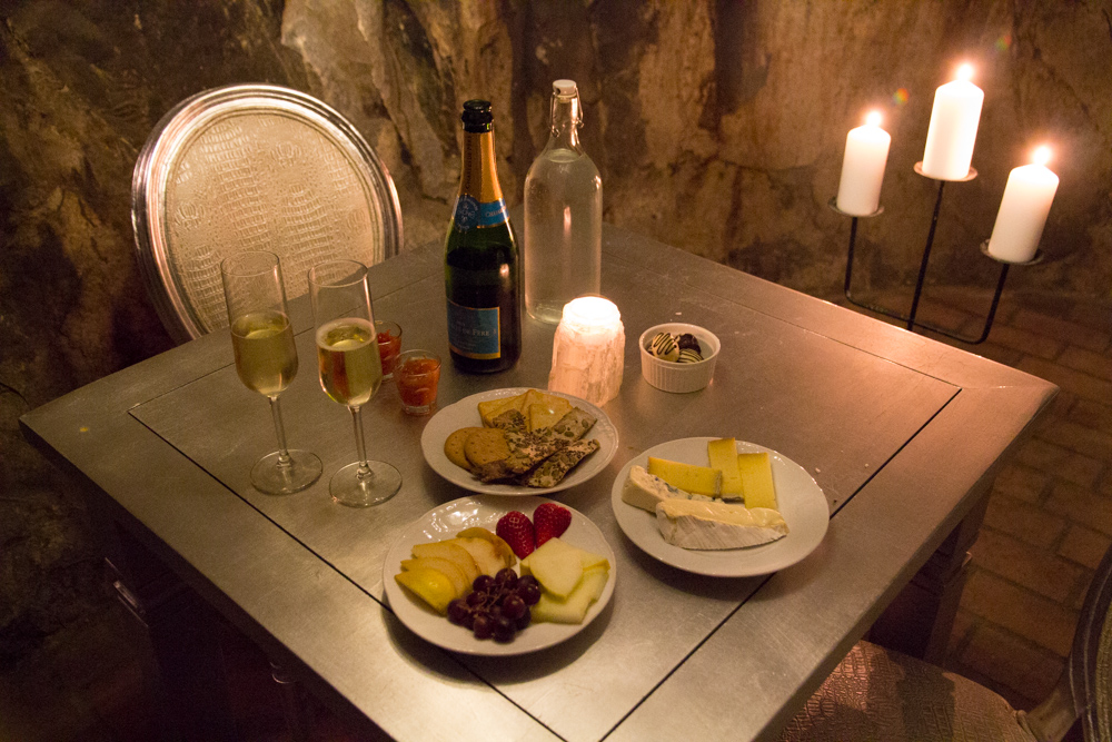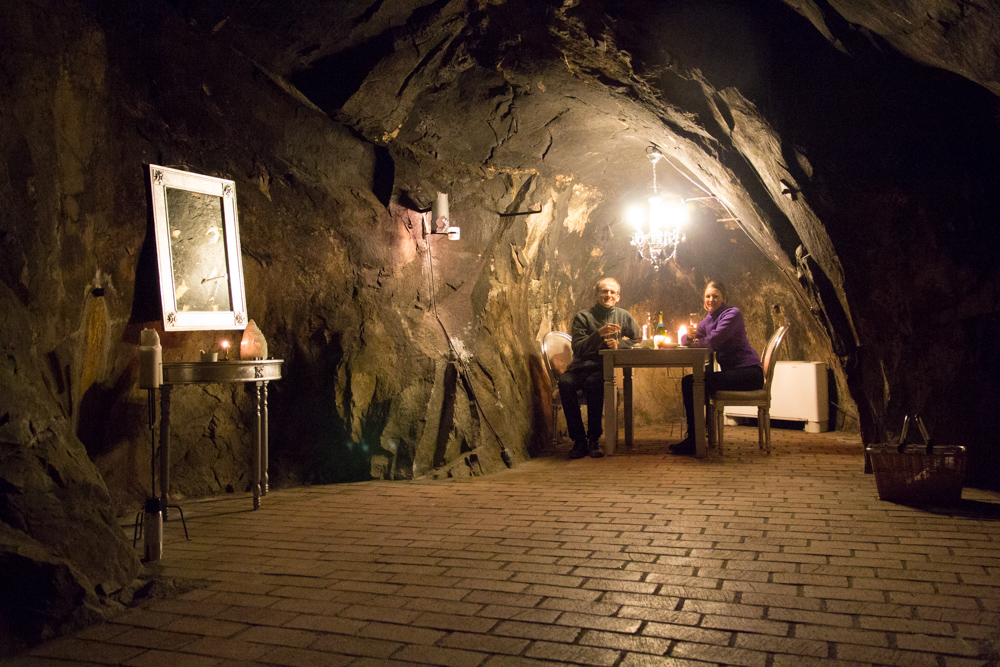 Sen blev vi lämnade i gruvan (dock med en radiolänk upp till vandrarhemmet). Vi hade fått en vickningskorg så vi dukade upp med ostar, choklad och skålade i mousserande vin, det var inte läskigt inne i själva salen, var bara en väldigt märklig känsla att ”jaha, här sitter vi en helt vanlig lördagkväll…”. Däremot var det läskigt att gå till toaletten som låg ca 50 bort i beckmörkret genom gruvgångar – dit gick jag inte själv… och inte utan dubbla ficklampor…