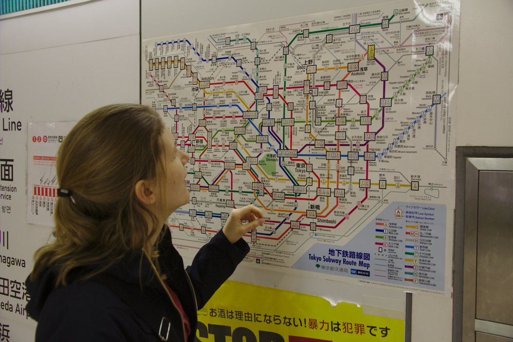 Tunnelbanan är riktigt smidig att åka och japanerna måste ju få MVG i logistik, allt är uttänkt i minsta detalj och japanerna är t.o.m. bättre på att köa än vad vi svenskar är. Däremot har vi insett att det här med att det finns folk anställda som trycker in folk i vagnarna bara är en myt på samma sätt som att tunnelbanan aldrig är försenad i Japan också är en myt.