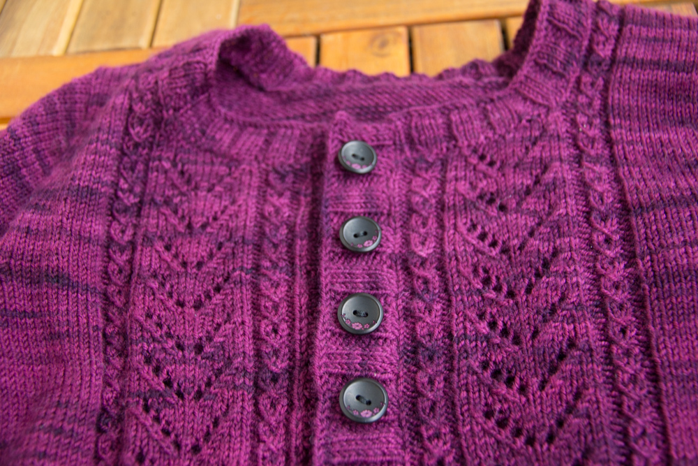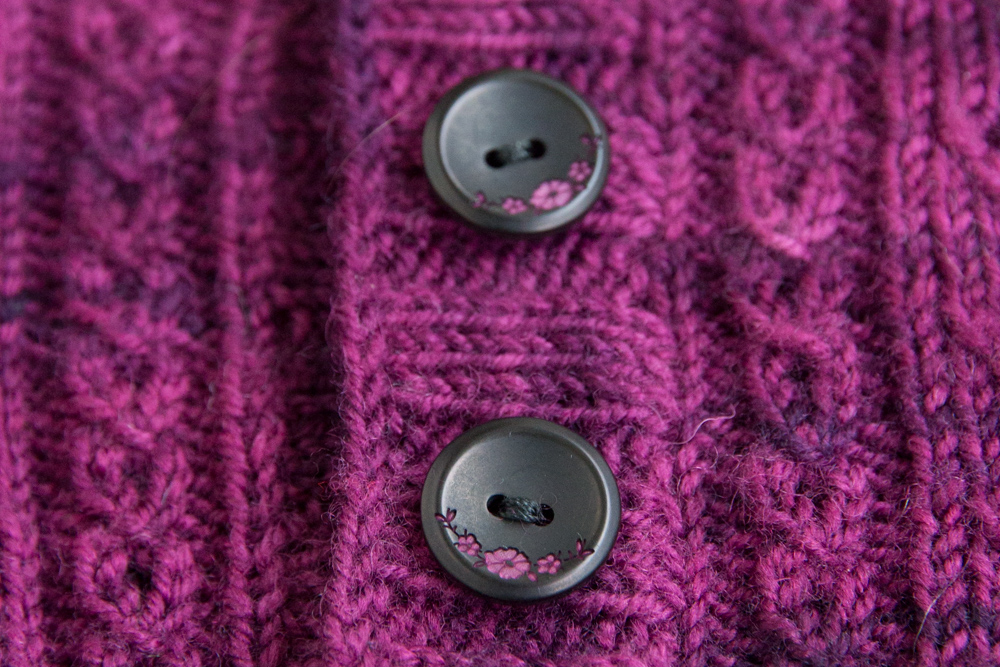 Det svåraste var att välja knappar. Först köpte jag rosa/lila knappar men märkte sen att de inte riktigt var rätt nyans. Sen köpte jag svart-vita randiga knappar men det blev inte så snyggt. Tredje gången gillt hittade jag dessa knappar som dock var ganska små, men då fick det bli många knappar 🙂