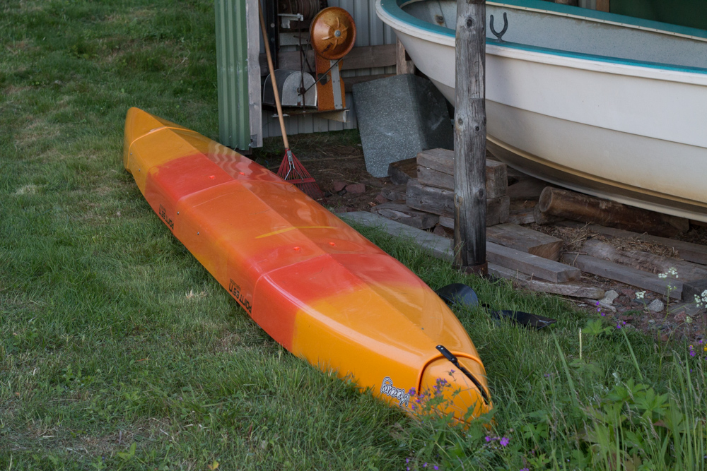 Hemma igen från det kallaste midsommarfirandet som jag kommer ihåg. Igår var det 9 grader och idag 7 grader vilket ju känns i alla fall 10 grader för kallt för att vara midsommar… Det hindrade dock inte mig och Patrik från att ta en provpaddlingstur med nya kajaken, det gick bra och var kul att paddla. Önskar mig väl dock lite mindre vind och lite mer sol till nästa gång. Eftersom jag hade fullt upp med att paddla så har jag inga bilder från just själva paddlingen, det får duga med en på (upp och nervända)kajaken.
