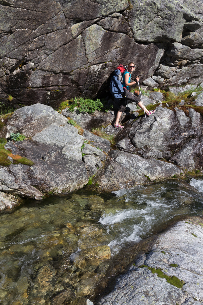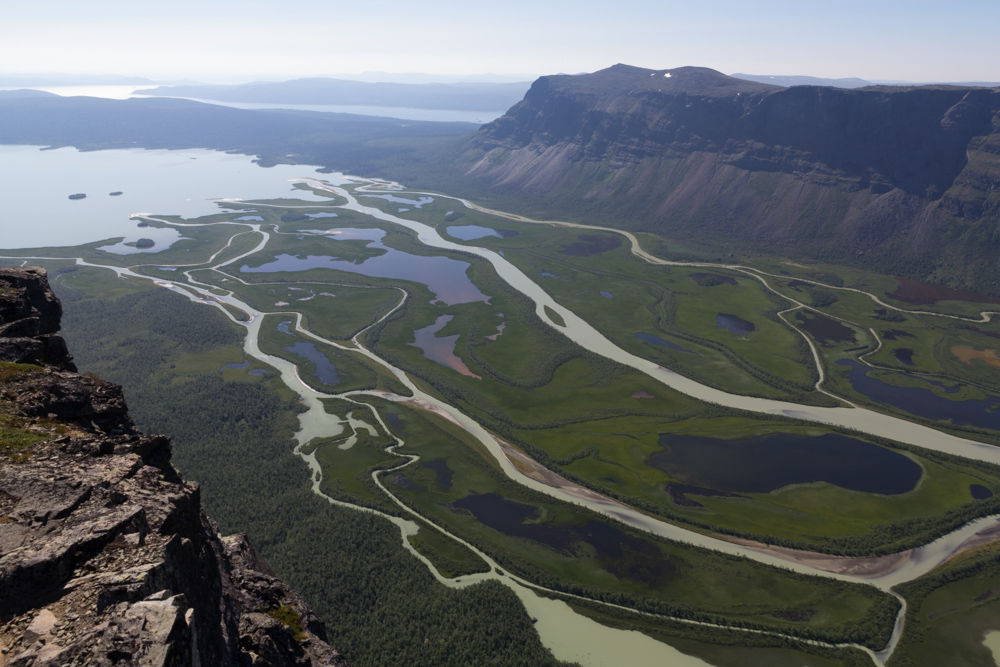 Turen fortsatte sedan sydväst mot bron över Guhkesvakkjåhkå vidare mot sjön Bierikjavre. Därifrån vidare västerut och sedan i riktning mot Rapadalen (förbi Spökstenen) mot Snavvajavvre. Från Snavvajavvre var det bara att gå ner i själva Rapadalen som var otroligt varm, myggig och med tät växtlighet, dvs man vill hellre se Rapadalen på avstånd. Vi planerade därför att vika av uppåt igen och gå den sk ”Höga vägen” genom Rapadalen vilket vi också gjorde. Vi kom upp till ”Höga vägen” men det knappt, det var vandring över myrar, genom videsnår och på slutet i princip klättring uppför en otroligt brant sluttning full med höga videsnår, vi var inte framme vid en okej tältplats förrän kl 21 vilket var i lite senaste laget. När vi väl nått Höga vägen var vandringen enklare med fjällhedar men även vissa blockiga/steniga partier som tog tid att ta sig igenom. Vi hade siktet inställt på Skierffe (hög klippa med utsikt över Rapadalen) och därifrån vidare mot Kungsleden som leder upp till Saltoluokta fjällstation där tre-rätters middag och varsin säng hägrade 🙂