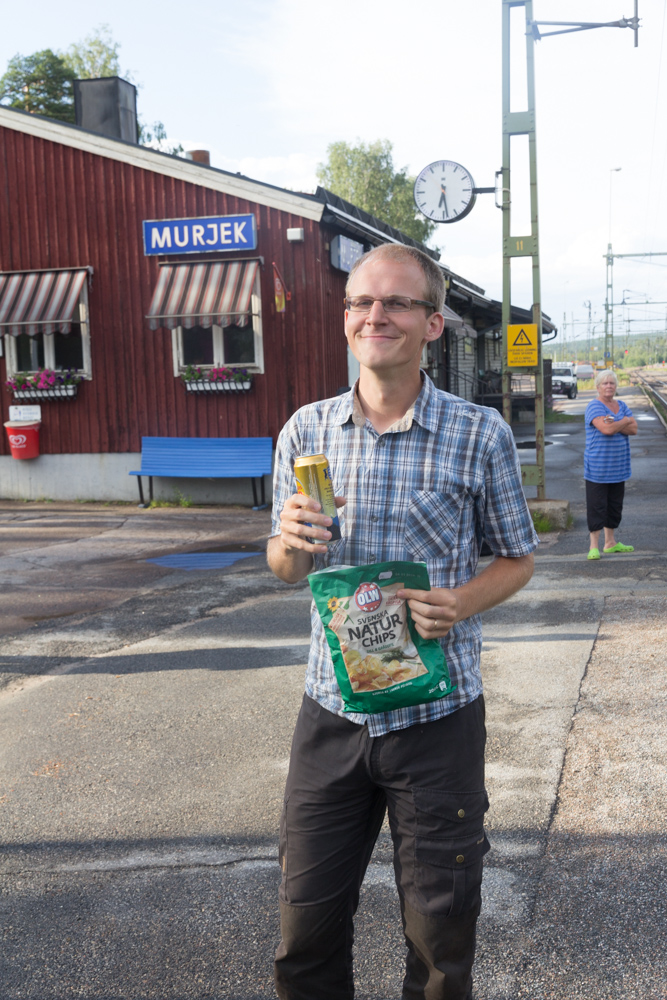 Hemresan (eller ja till Stugan i Höga kusten) bestod av båt-buss-tåg-ersättningsbuss-tåg-tåg-bil. Även hemresan blev 3 timmar försenad, denna gång pga blixtnedslag i ett ställverk vilket gjorde att vi fastnade i metropolen Murjek. Hon som hade en liten kiosk i stationshuset sålde dock Norrlands guld och chips som aldrig förr… 🙂