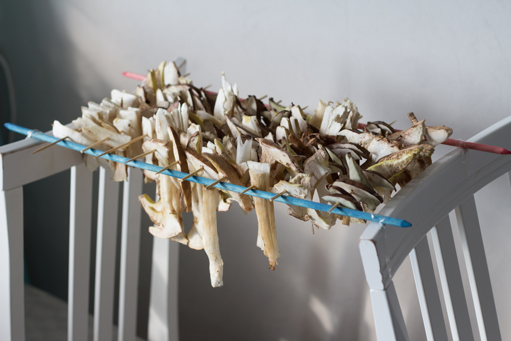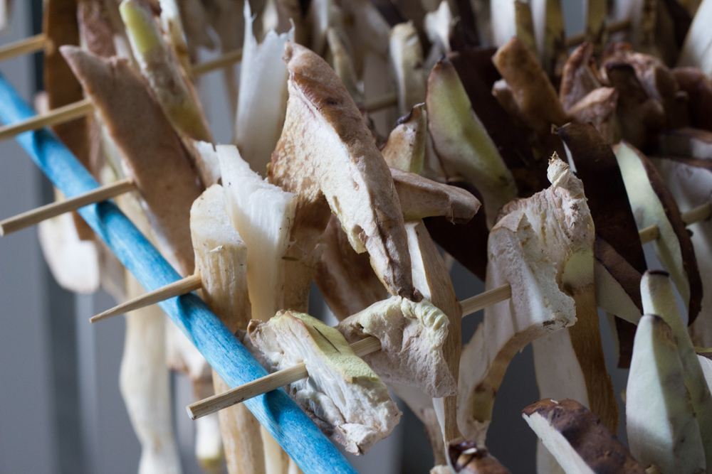 Sopparna (Karl Johan) skar vi i tunna skivor och trädde på grillspett, nu hänger de på tork.