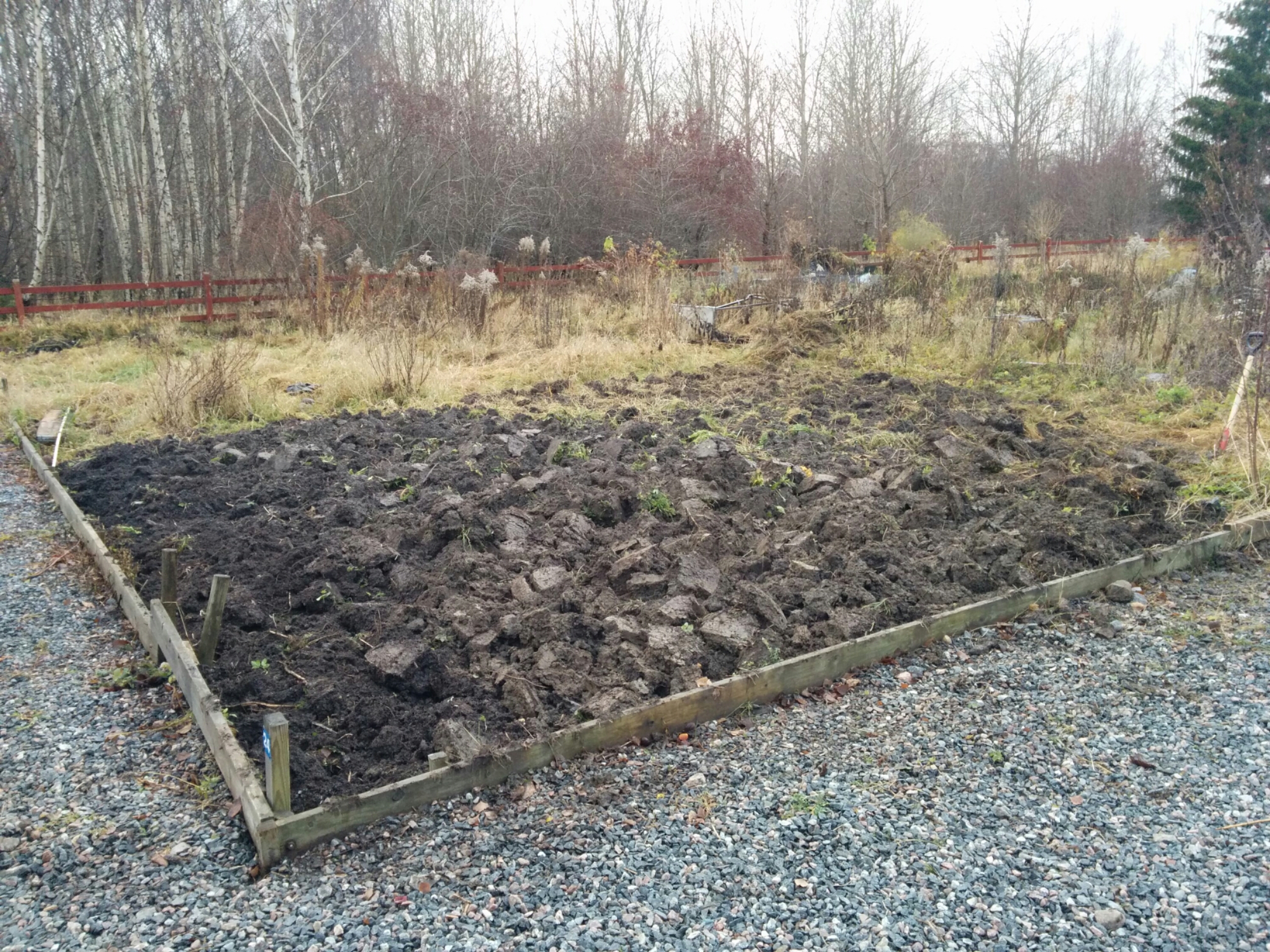 Idag har vi varit ute i det gråa novembervädret och grävt på kolonilotten. Vi har kommit en bra bit även om det fortfarande är mycket kvar. Vi mätte upp att vi totalt har ca 120 m2 att odla på, det är mycket att gräva…