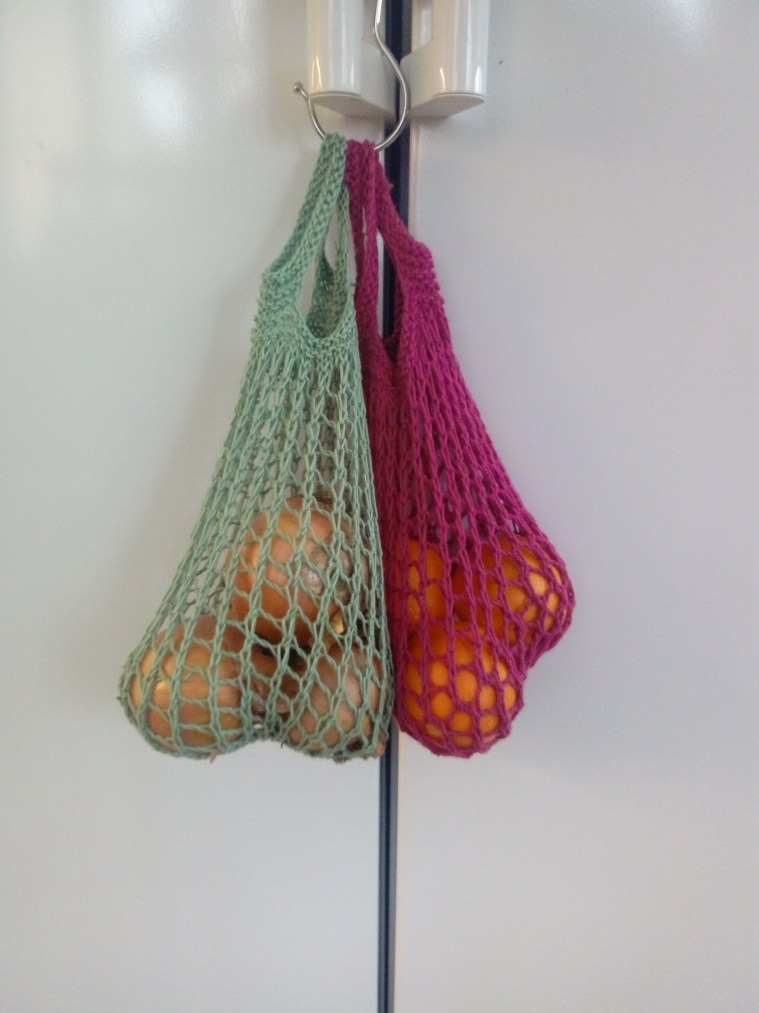 Jag hade bara tänkt sticka en påse men det var en så himla rolig stickning så det blev 3 st av bara farten. Jag har använt restgarn av bomull som jag hade i gömmorna här hemma. Jag är mycket nöjd och har använt dem i affären några gånger (och bara fått lite höjda ögonbryn från kasörskan…). Påsarna väger ca 15-20 gram vilket ju för de flesta grönsaker/frukt man köper inte ger någon märkbar påverkan på priset.