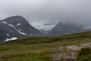 Väderprognosen talade dock om att det skulle klarna upp vid 12-tiden varför vi strax efter 10-tiden gav oss iväg på ett toppförsök. Nästa direkt drog dimmolnen in och det började regna. Vi klädde på oss regnkläder och fortsatte, det skulle ju klarna!!! Vi följde den rösade leden och sikten var så dålig att man bara såg ett röse framåt. Vi korsade en å och det blev klippigare. Regnet tilltog och vi var blöta och rikigt kalla. Det verkade inte vara på väg att klarna och vi tog därför beslutet att vända tillbaka. Vi hade då nått till ca 1450 m. Vi tog oss ner en bit och lagade i regnet till frystorkade lunchporttioner, fingrarna var dock så kalla att det var svårt att få upp dem och börja äta. Vi fortsatte neråt och kom ner under molnen, regnet avtog sakta och efter ett tag tog vi en choklad och kaffe/te- paus. Vi tog oss tillbaka till stationen och packade om väskorna och gav oss iväg för att hinna en bit mot Blåhammaren. När vi kom ut var alla moln som bortblåsta och syltoppen var omgiven av klarblå himmel. Typiskt!