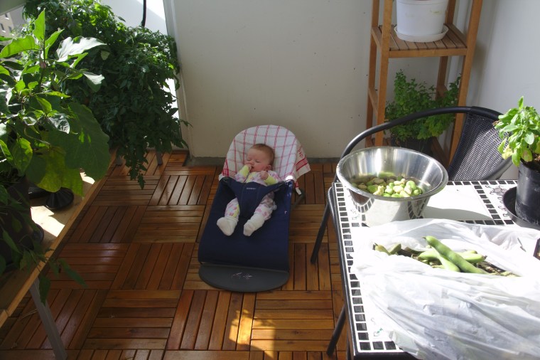 Idag har jag haft sällskap på balkongen när jag rensade årets skörd av bondbönor och sen har vi varit ute på skogspromenad.