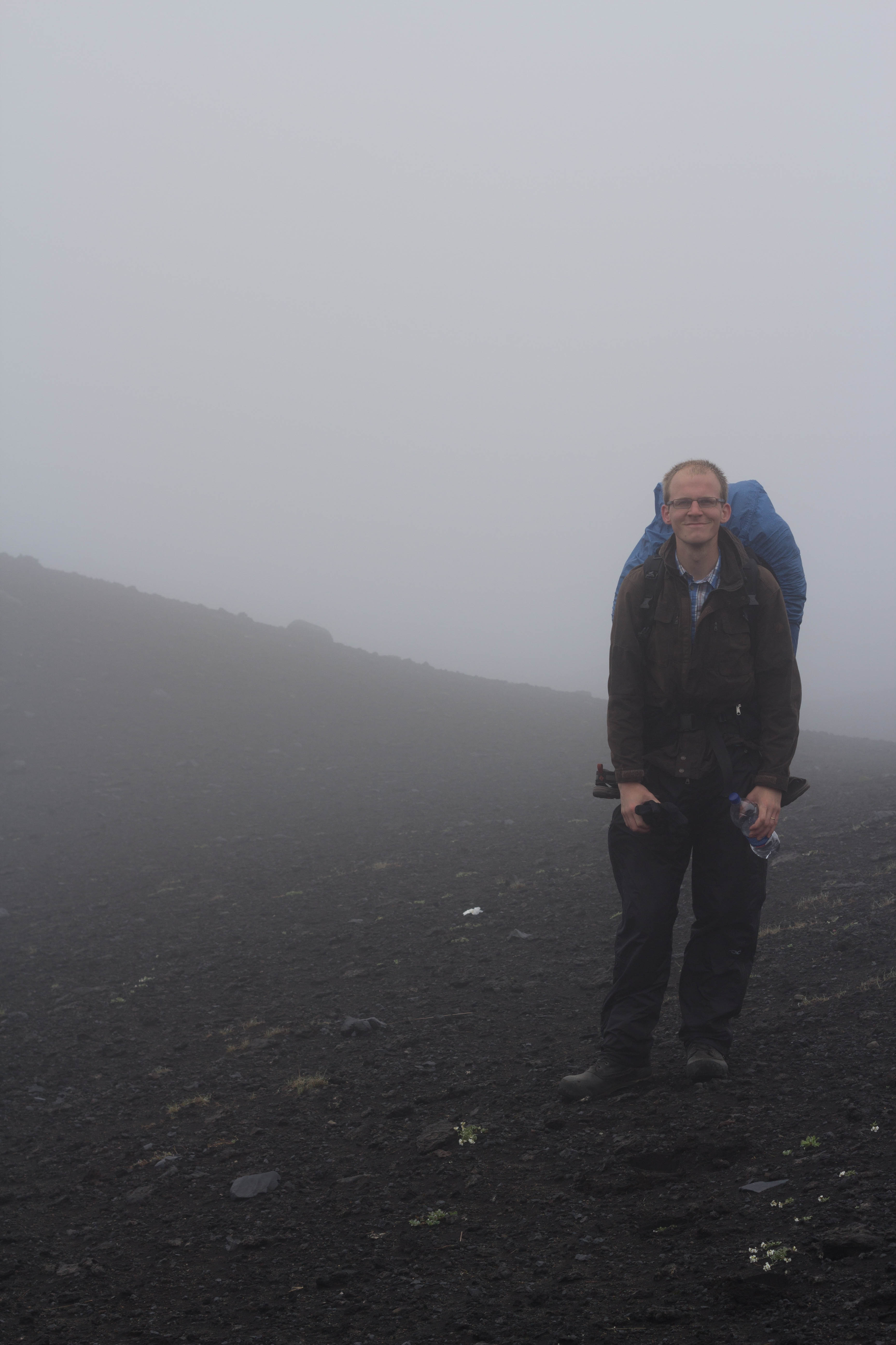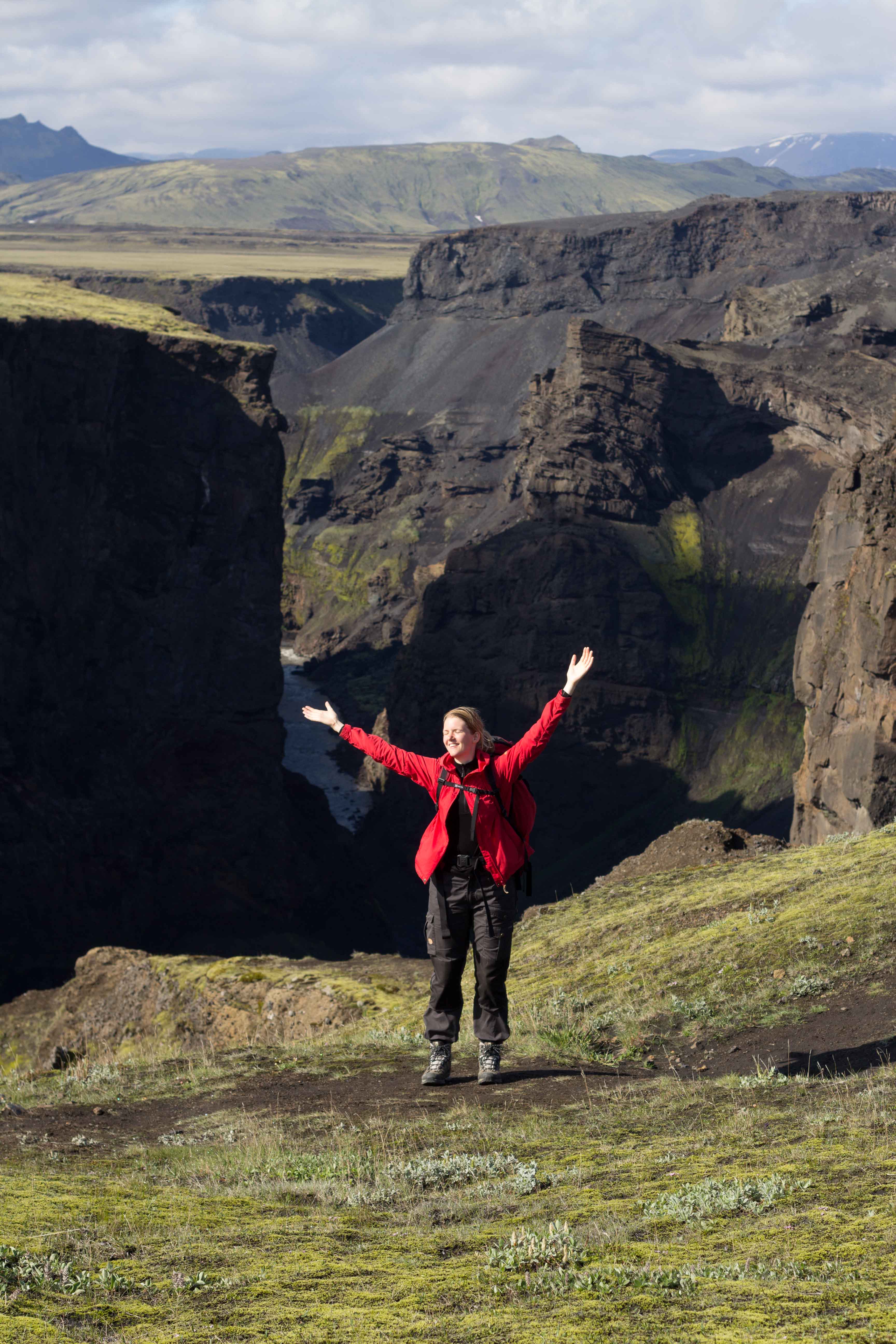 Dag 3 mellan Alftavatn (som betyder svansjön) och Botnar, 15 km bjöd på vandring genom landskap med svart sand, under själva vandringen var vi dock mestadels insvepta i dimma/duggregn som dock var snällt nog att göra lite uppehåll så att vi kunde äta lunch och pausa i hyfsat bra väder. När vi kom fram till stugan klarnade det dock och solen lyste på oss hela kvällen och vi tog en liten extra vandringtur efter att ha fått upp tältet till en sjukt maffig ravin (160-180 m hög). Ravinen gör sig inte alls på bild, den var mycket häftigare i verkligheten när man såg fåglar sväva runt långt nere i ravinen.Ravinens namn var dock väldigt svårt att uttala, Markarflótsgljúfur.