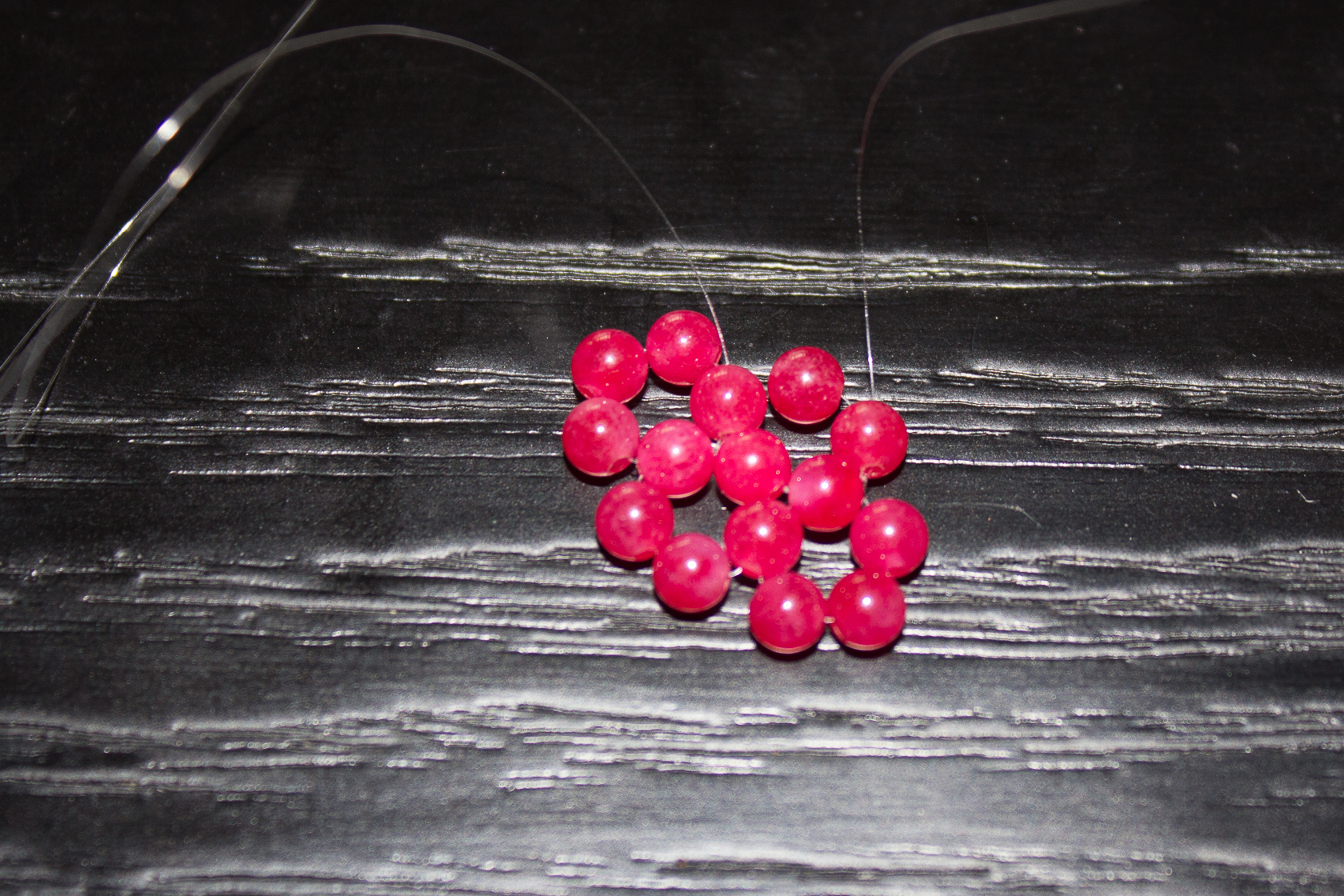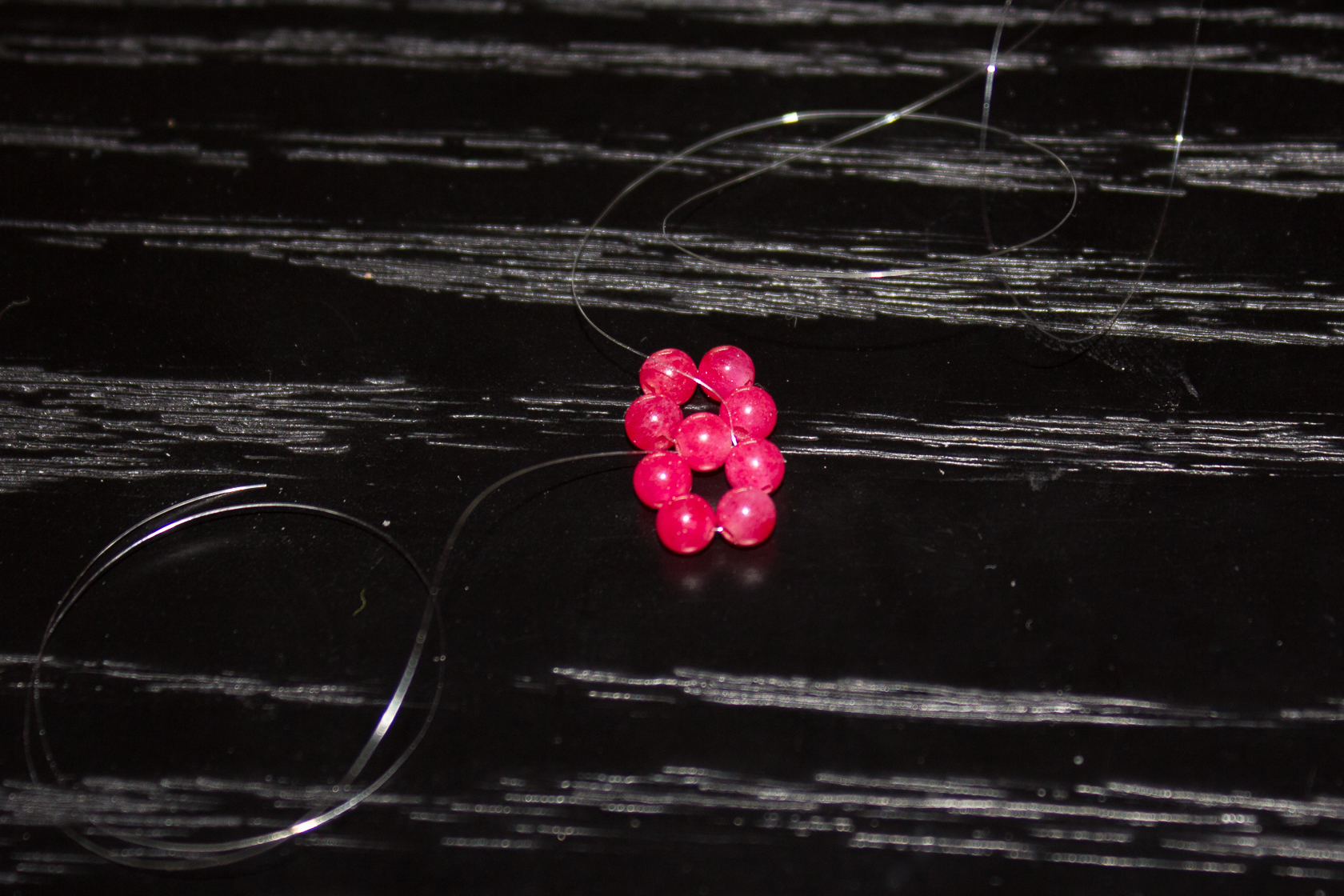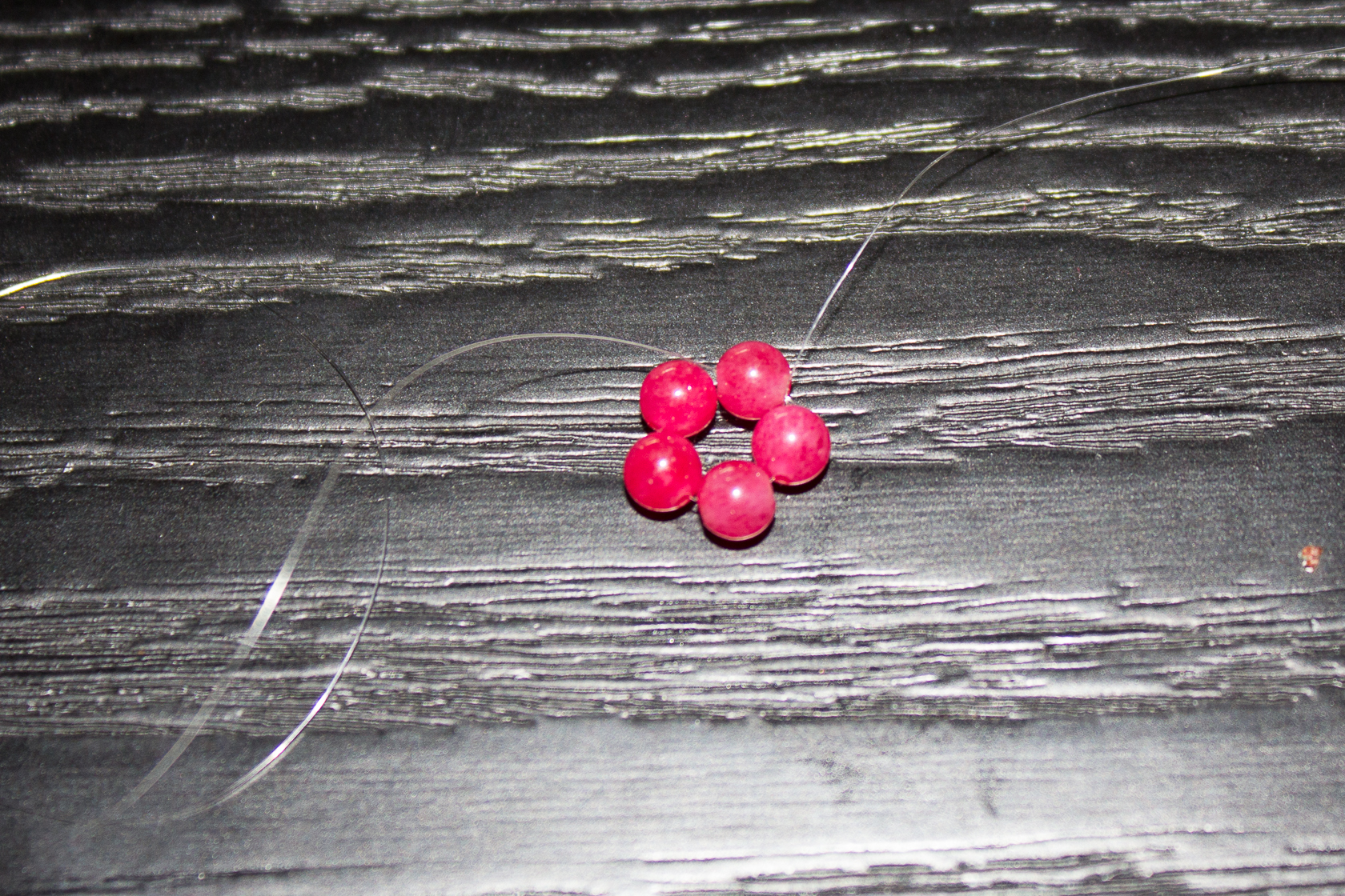 1. Trä på 5 pärlor och för tråden genom första pärlan så att de bildar en ring