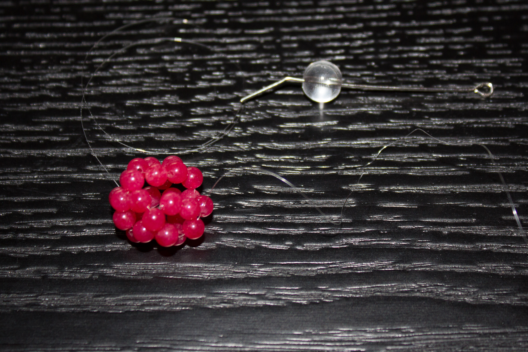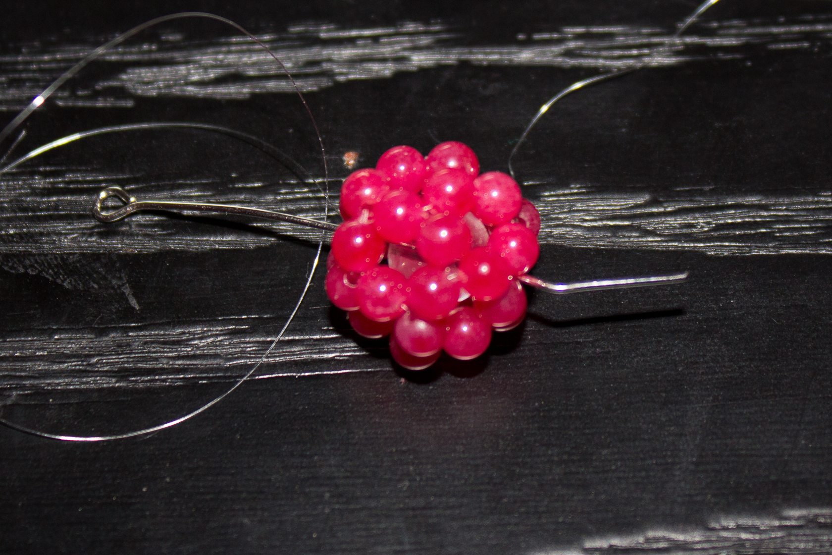5. Jag ville ha mitt hallon som ett hängande smycke och kom därför på denna lösning. Innan sista ”hallonpärlan” träs på stoppade jag in en glaspärla på en öglepinne i hallonet och avslutade sedan själva pärlbollen (vilket var pillrigt) med glaspärlan inne i hallonet. Eller ja, på försök nr 2 gjorde jag så…